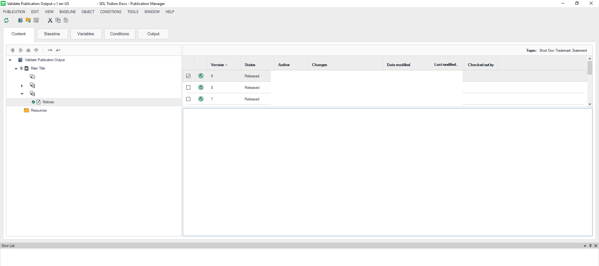 Screenshot of Trados Studio's Publication Manager interface with a map selected, showing an empty preview pane where the XML preview should be, indicating a similar issue as in XMetaL.