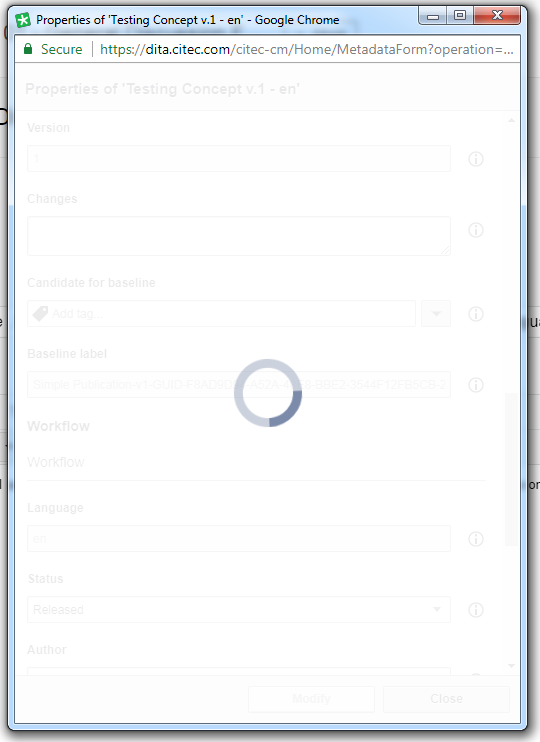 Screenshot of Trados Studio's 'Properties of Testing Concept v1.1' window with a processing icon indicating a loading or saving action that is not completing.