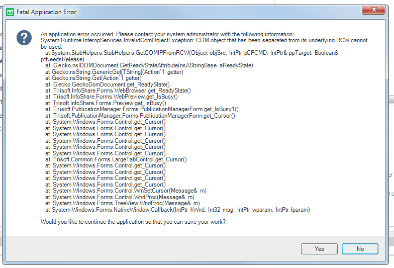 Since upgrading to SDL Publication Manager 13.0.1, our users are experiencing the above crash in what appears to originate in the Gecko.ns codebase.  The crash is not actually fatal, as users can select "Yes" and continue on.  This is more of an annoying thing that happens usually shortly after checking in a topic or publication from XMetaL.  It is worth noting that the check-in action completes successfully, but this error will occur (only occasionally) after a user has clicked on a different topic from the list of publication elements from their tree.