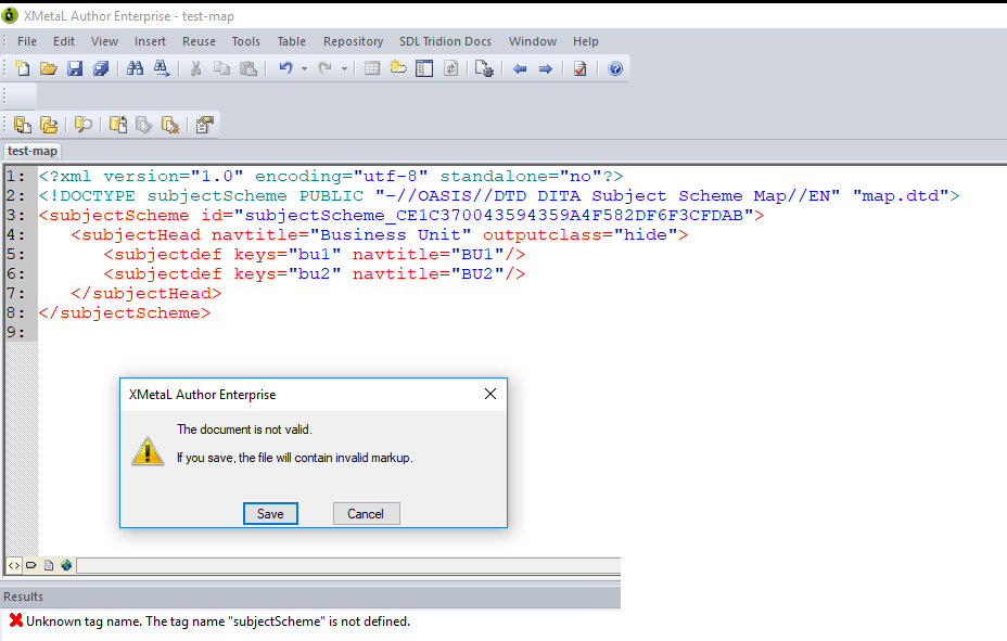 4. What's not working is we are attempting to add a subject scheme object to our system is that XMetaL/SDL indicates the DITA is not valid or unknown and throws an error message. We believe this is because the DOCTYPE is unknown. A screenshot of the error example is attached.Error message in XMetaL Author Enterprise stating 'The document is not valid. If you save, the file will contain invalid markup.' with options to Save, Cancel, or view the full error report.