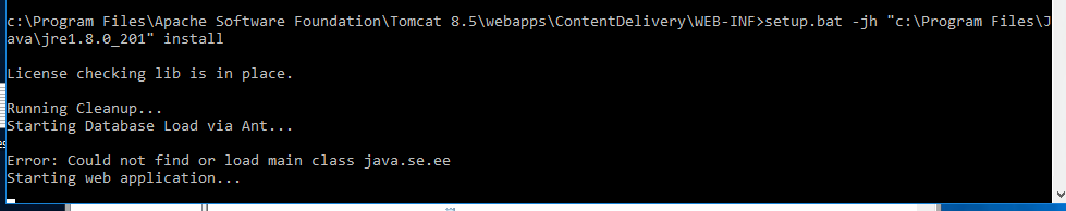 Anyone have an idea on how to solve this? Java runs 100% as expected otherwise and Tomcat works great with any of those java jvms set. I'm at a total loss. Command prompt showing error during setup of Collab Review 7.7. Error message reads 'Could not find or load main class java.se.ee' after attempting to start database load.