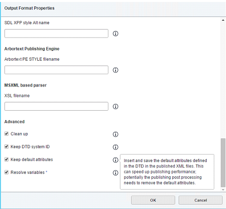 The field, FISHKEEPFIXEDATTRIBUTES, was added to improve publishing in the 10.0.1 release (LiveContent 2013sp1). In the user interface this is seen as a new checkbox, Keep default attributes, on the output format. This option, when checked, means that the attributes which have fixed defaults in DTD (#FIXED) are added to the XML file when they are exported during publishing. This results in the DTD not needing to be loaded again, since the needed attributes are in the XML document at publish time.