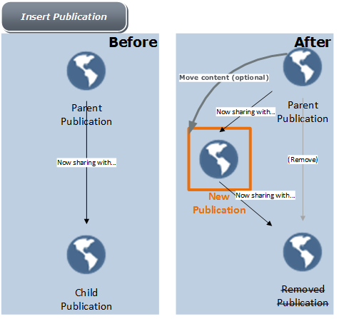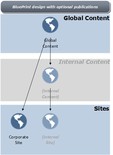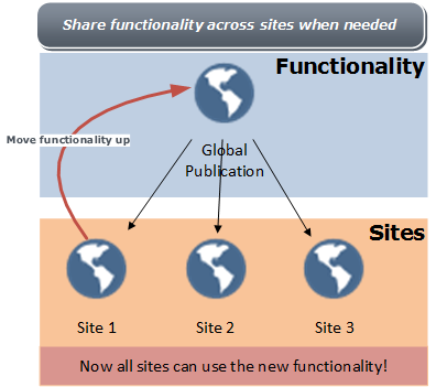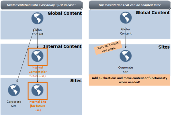 We always had the ability to add Publications to a BluePrint later. But being able to also move items up and down a BluePrint further addresses the "just in case" mentality that you need all possible scenarios up front. Instead of the scenario below on the left, with every Publication created even when not needed, you can start with the scenario on the right. Start smart, start small, and add publications, moving content or functionality when your project calls for it.