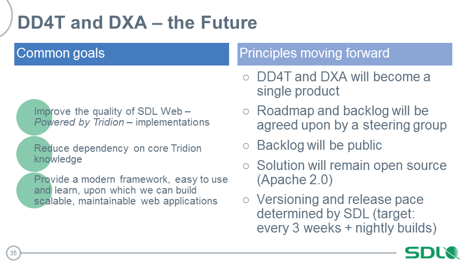 If you attended the excellent Tridion Developer Summit 2016, you may recall that we announced a merger of the DXA and DD4T projects during the keynote session, and now we’d like to take this opportunity to dive deeper into what exactly this means to the product and the larger group of implementers that today use one, both or a combination of these solutions to improve the quality of their implementations.