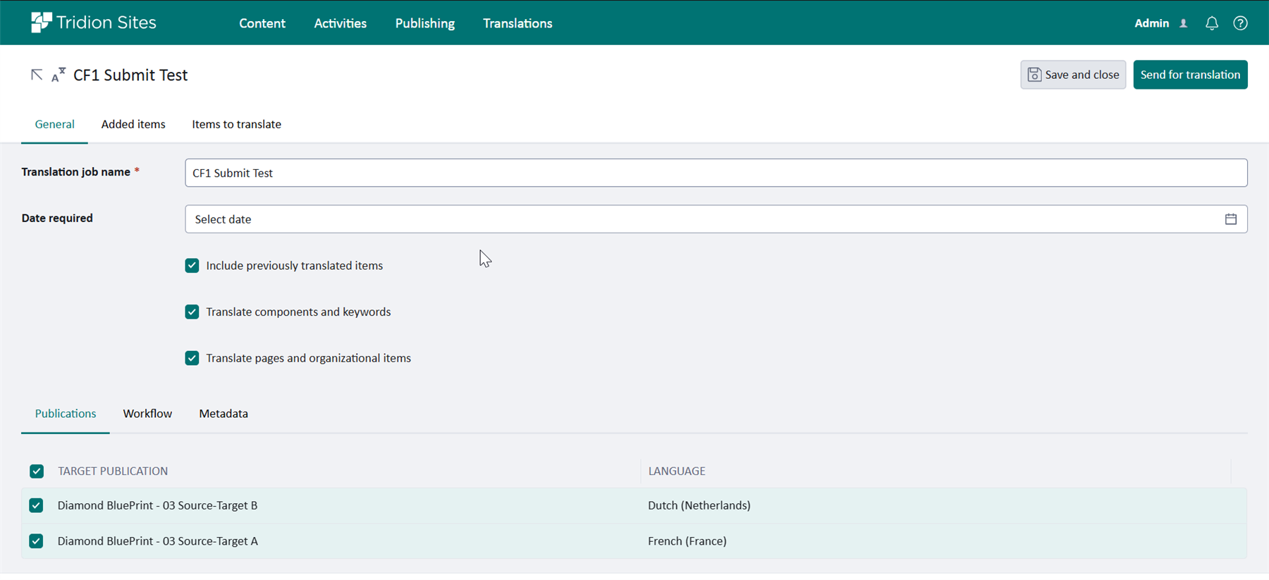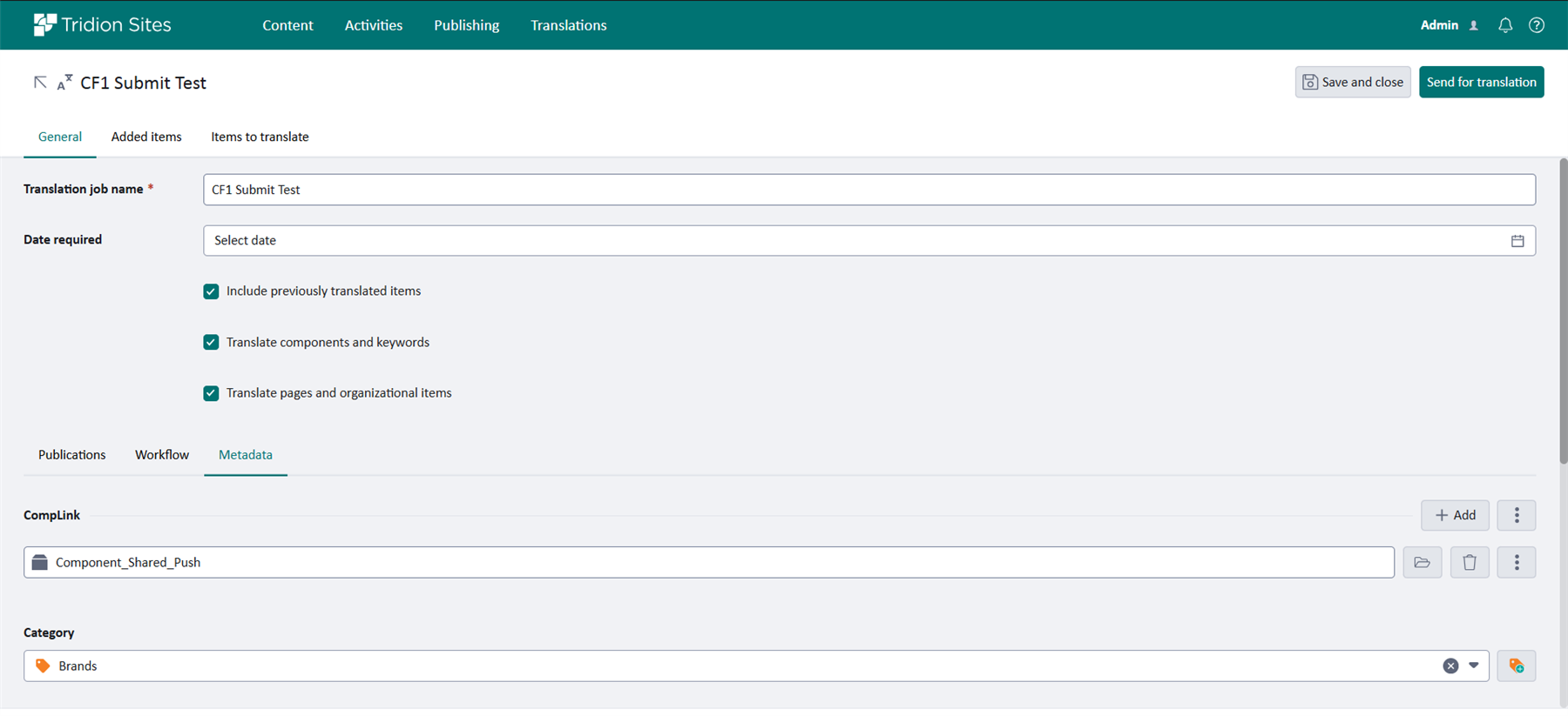 An updated Translation job editor (which can be opened in a separate tab) supporting editing of custom metadata. Instead of the popup in the previous version, it will now open the full-page editor. We added the "Items to translate" tab in the editor. This list updates dynamically in response to changes in the check boxes on the General tab.