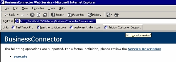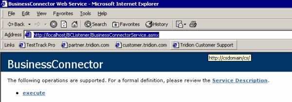 Open Internet Explorer and connect to http://localhost/BCListener/BusinessConnectorService.asmx check if you get the following page back: