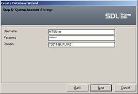 Enter the MTSUser accound information. If this account does not yet exist or the information is incorrect you will receive a warning message. Make sure the Domain field has the current machine name. Click Next.