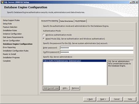 Choose "Mixed Mode" authentication (required), enter a password for the SA user, and add the current user to the list of administrators.