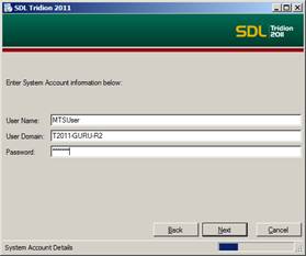 You must now provide the login information for the Tridion System account (MTSUser)