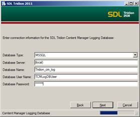 Enter now the information for the Tridion Logging database.
