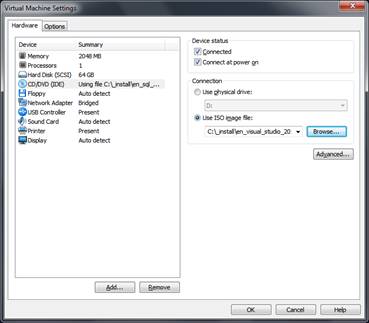 Map the VM CD/DVD drive to the ISO file with the Visual Studio installation files
