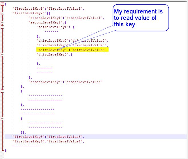 As you can see in above document, my need was to access the value of key “thirdLevelKey4”. I did try lots of solutions which I found in google, and was able to access only ‘firstLevelKeys’ and ‘secondLevelKeys’ but not the ‘thirdLevelKeys’.