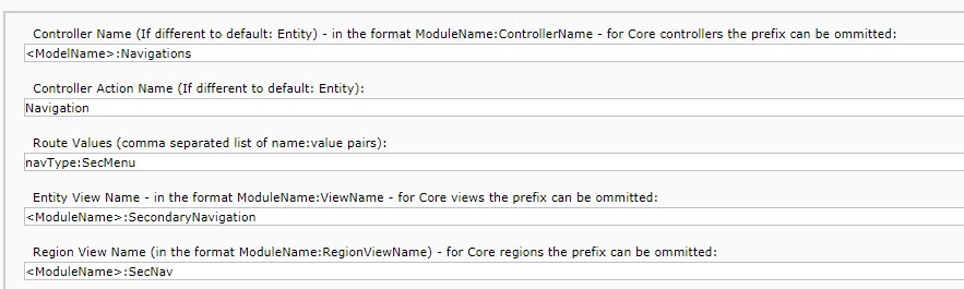 - Create a component template for secondary navigation and mention the Route Values as navType:SecMenu. Rest of the Value will be as per your implementation. (Refer the below Image)