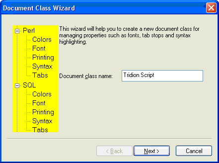 - Create a new document class called 'Tridion Script' by choosing 'New document class' from the Configure menu.
