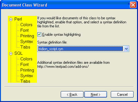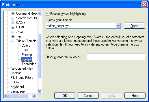- Click on Syntax and make sure that syntax highlighting is enabled and the tridion_script.syn file is selected.