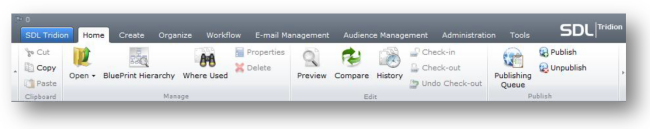 The buttons and controls of the main view are displayed in a ribbon as shown in Figure 3. The ribbon is a tabbed toolbar, which contains controls for all the operations you can perform. The extension points of the ribbon and context menus include adding additional tabs and buttons as well as overriding the functionality of existing buttons. The controls of the ribbon and context menu are enabled or disabled based on selections made in the list view below and permissions of the user.
