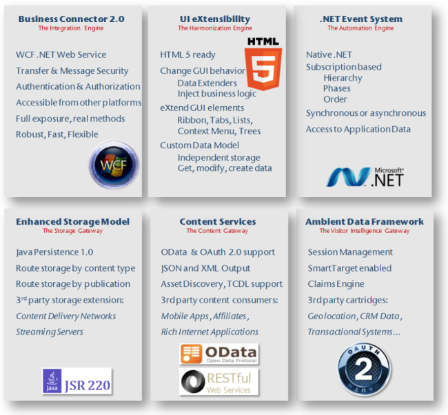 The Content Delivery extension points allow you to integrate your online ecosystem through the use of open standards such as JSR 220, OData, RESTful web services and OAuth.