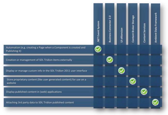 SDL Tridion comes with a broad extension framework. This document explains how to utilize the standardized interfaces to integrate SDL Tridion with your IT ecosystem. Whilst SDL Tridion offers you standard features to enable your content and channel strategy to drive the business end of your interaction, there will always be a wish to leverage your existing software investments by means of back-end integrations. SDL Tridion caters for this need through its extension framework. On both the Content Management, as well as the Content Delivery side there are a wide range of extension points, which allow you to extend functionality without the need for customizations.