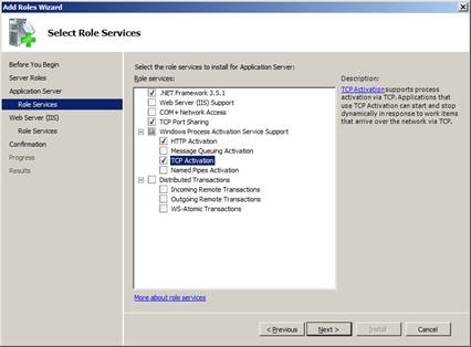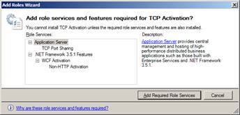 Select to add HTTP Activation and TCP Activation under "Windows Process Activation Service Support"