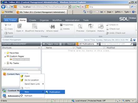 Right-click on "Content Management" and select New -> Publication from the context menu