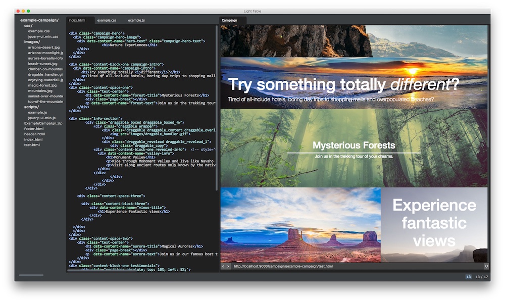 • index.html - the main HTML markup for campaign content. Is not a full HTML page, only a HTML fragment for the actual campaign.