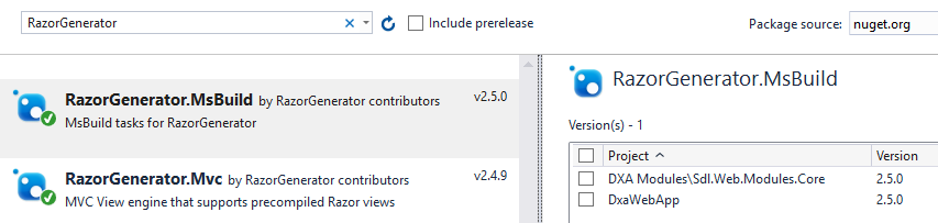 - Search for "RazorGenerator"; You will find "RazorGenerator.MsBuild" and "RazorGenerator.Mvc"