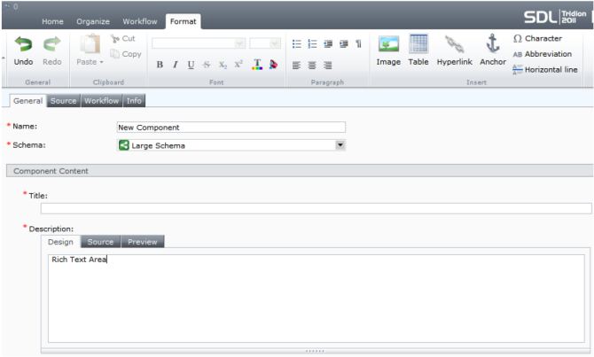 Lets do some quick level setting to understand how useful this feature is. In case you are unfamiliar with the concept, a Rich Text field in Tridion is an area where you can format text with many of the same features you have in Microsoft Word. If you have one Rich Text field in a component, it typically contains the main content for the element you are creating. A simple article component may contain one large Rich Text field where you would have all the formatting elements needed to create a nice looking article.