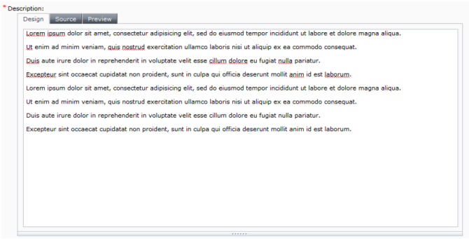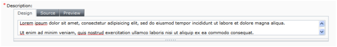 In Tridion 2011, the Rich Text field is resizable by the content author. The text field that you thought would only need to be seen in 2 lines can be resized to the 10 or 20 lines now needed. This feature is especially useful for large components containing multi-value Rich Text fields. Instead of having users scroll down a huge list of 20 fields that are each the height of your screen, you can provide small Rich Text fields that allow users to quickly find the one they need and then expand it to a size they can work in.