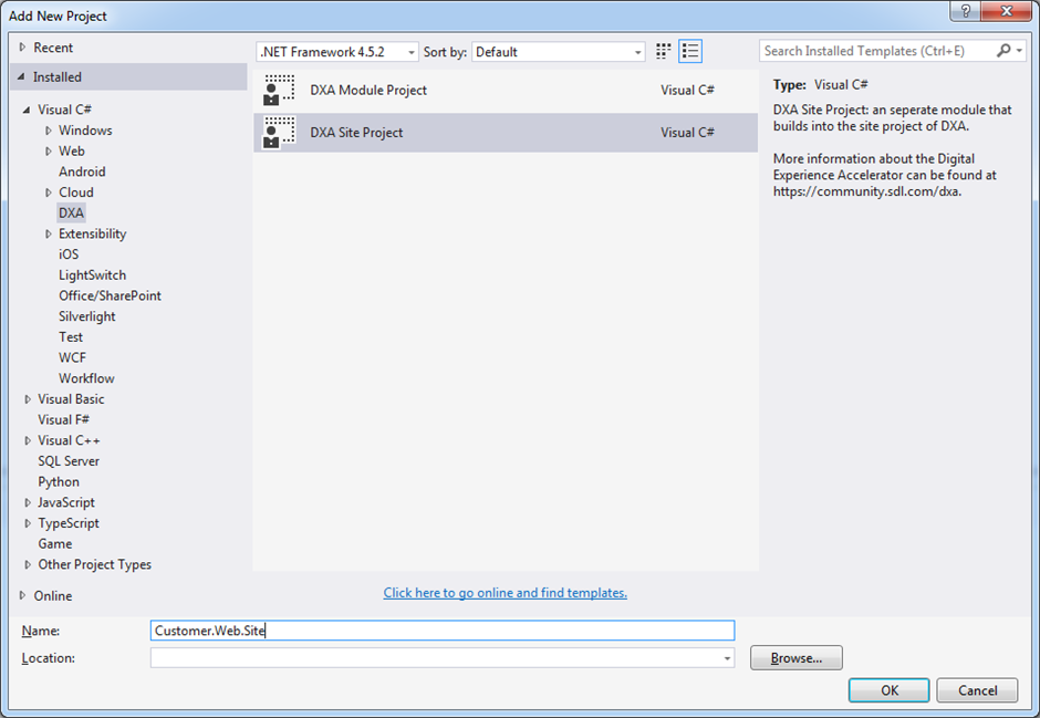 With the extension downloaded and installed, when adding a new project, the DXA option becomes visible below Visual C#, DXA. For our work today, select the Site Project.