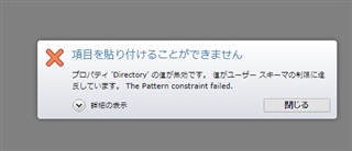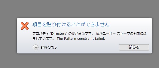 The Pattern constraint failed. The value of property 'Directory' is invalid. The value violates the restriction of the user schema.