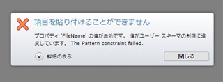 The Pattern constraint failed. The value of property 'Filename' is invalid. The value violates the restriction of the user schema.