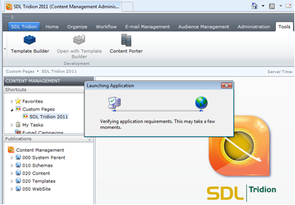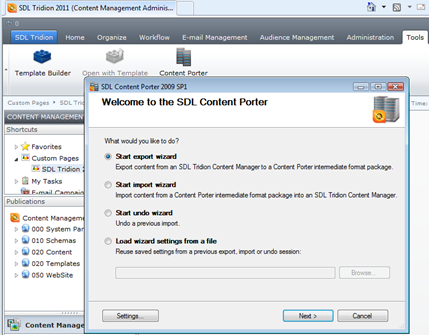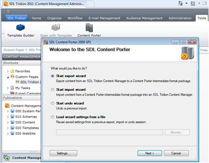 In the SDL Tridion Content Manager GUI, navigate to the Tools tab and click the "Content Porter" icon. The client software will install locally and start.