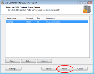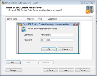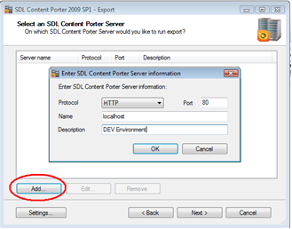 Click "Add" to setup a new server if none have been setup before. The "Enter SDL Content Porter Server Information" comes up. Fill in the current DEV CMS server you want to connect to and click OK.