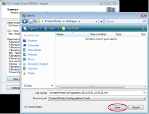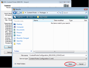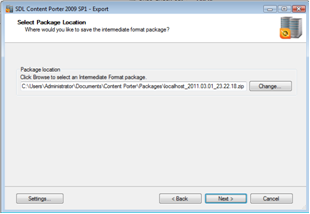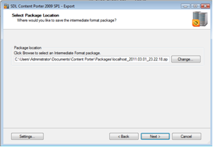 Content Porter will apply a timestamp to the package. Select a different location for storing the package if desired by clicking Change. When ready, click Next.