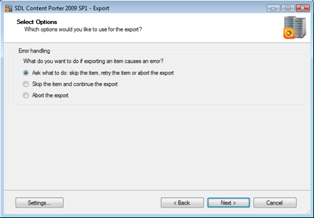 Should an error occur, for smaller packages, choose to be notified as soon as this happens, otherwise skip and continue. If the export must be treated as a transactional process, choose Abort on error. Click Next.