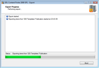 Content Porter begins to export the items and provides status on progress.