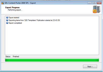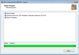 When the export completes, note the status and click Next.