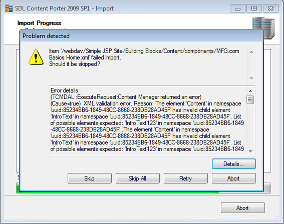 Using the Content Porter, import the building blocks into SDL Tridion, paying special attention to Schema validation errors such as the one show below:
