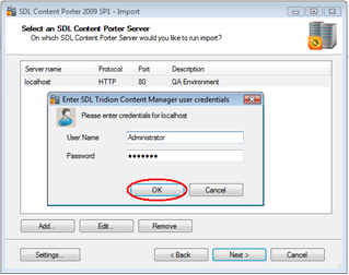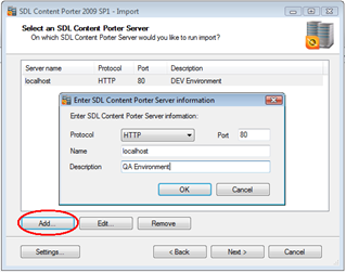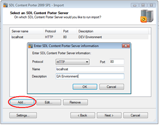 Click "Add" to setup a new server if the import environment has not been setup before. The "Enter SDL Content Porter Server Information" comes up. Fill in the current QA CMS server you want to connect to and click OK.