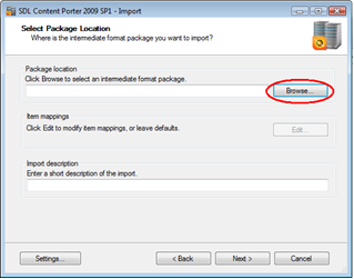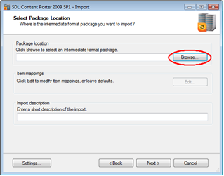 Content Porter will connect to the server using the credentials provided and prompt to select a package for import. Click "Browse".