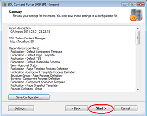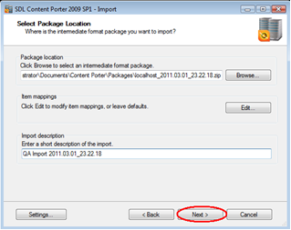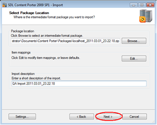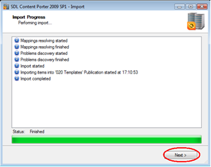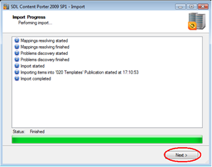 Content Porter will start processing the package for import according to the options selected so far and report progress for each import stage. Once this is complete, click "Next".
