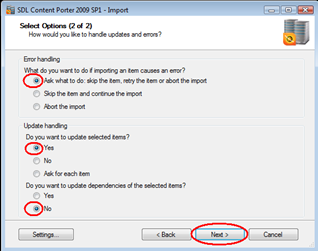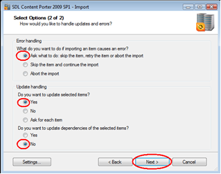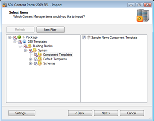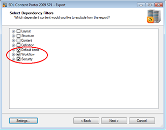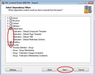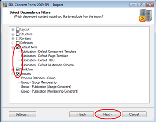 Unless you are exporting updates or new items for workflow, security or default templates, these items can and should be excluded from the import to shorten the amount of items Content Porter will process. Select them and click Next.