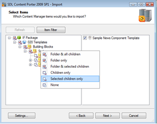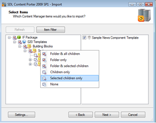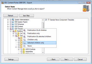 Right clicking on organizational items in the left panel, brings up a menu, which allows additional filtering for items to be ported. This menu can be used when, for example, there is metadata associated with a folder, structure group or publication which perhaps differs by environment and should not be updated during import.