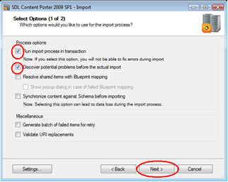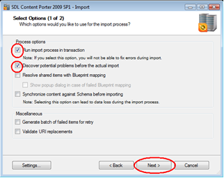 Running the import in discovery mode will allow Content Porter to analyze the intermediate package and target environment to find potential problems ahead of the actual import. Click Next.