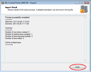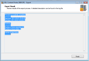 Review the items reported as exported to match against what was tagged for export (remember the count will include dependencies) and click Finish when ready.