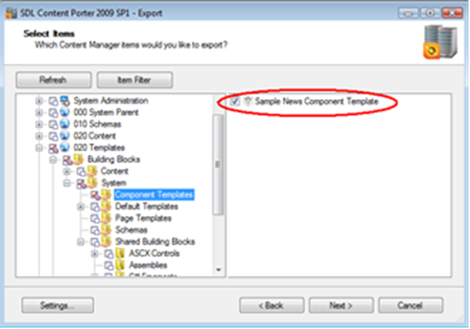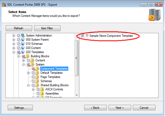 Using the Content Porter you can easily select the items you want to export by expanding the navigation tree (left pane) and using the check boxes on the right to select the individual building blocks to Export.