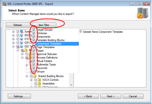 For a clearer view of what needs to be selected, click "Item Filter" and check the item types you do not wish to see on the screen. Note that if an item has been previously selected, it will still be selected even though it is hidden by the filter check. When all items for export have been selected, click Next.
