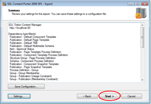 Review the export settings, choose to save a configuration file if you anticipate running the export again, then click Start to begin.