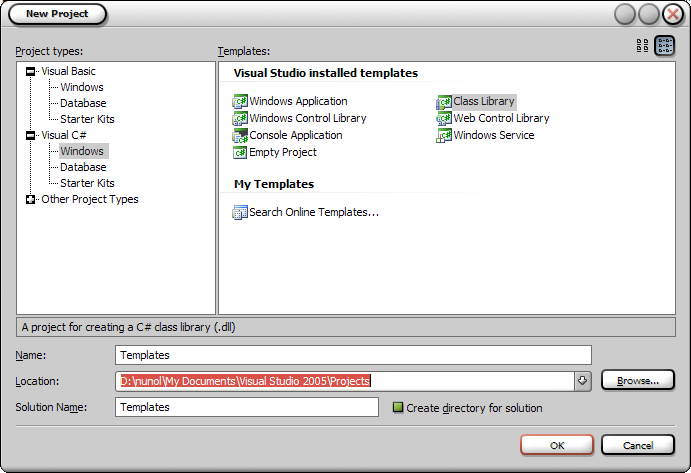 Using Visual Studio (.NET 2003 or 2005) create a new project. For simplicity reasons we'll just call it Templates.
