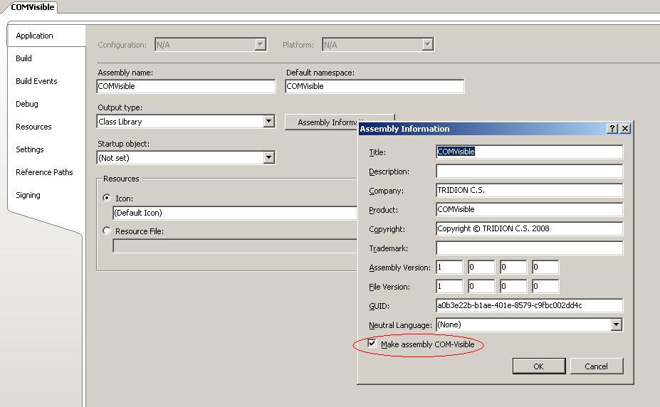 - Select the option Make assembly COM-Visible.